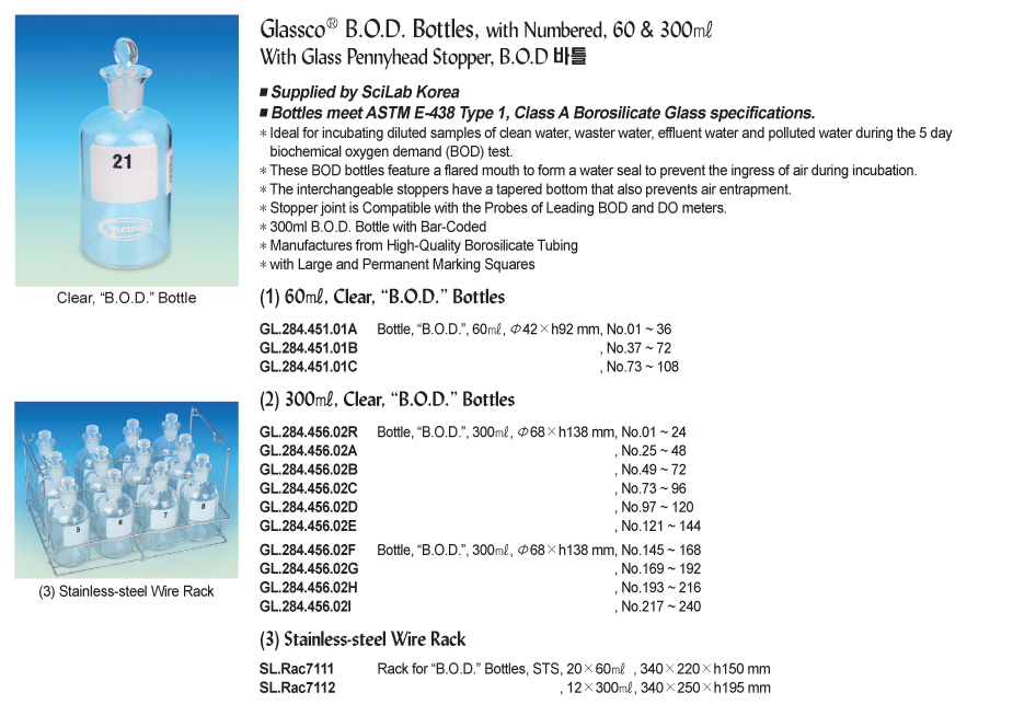 Glassco® B.O.D. Bottles, with Numbered, 60 & 300㎖ With Glass Pennyhead Stopper