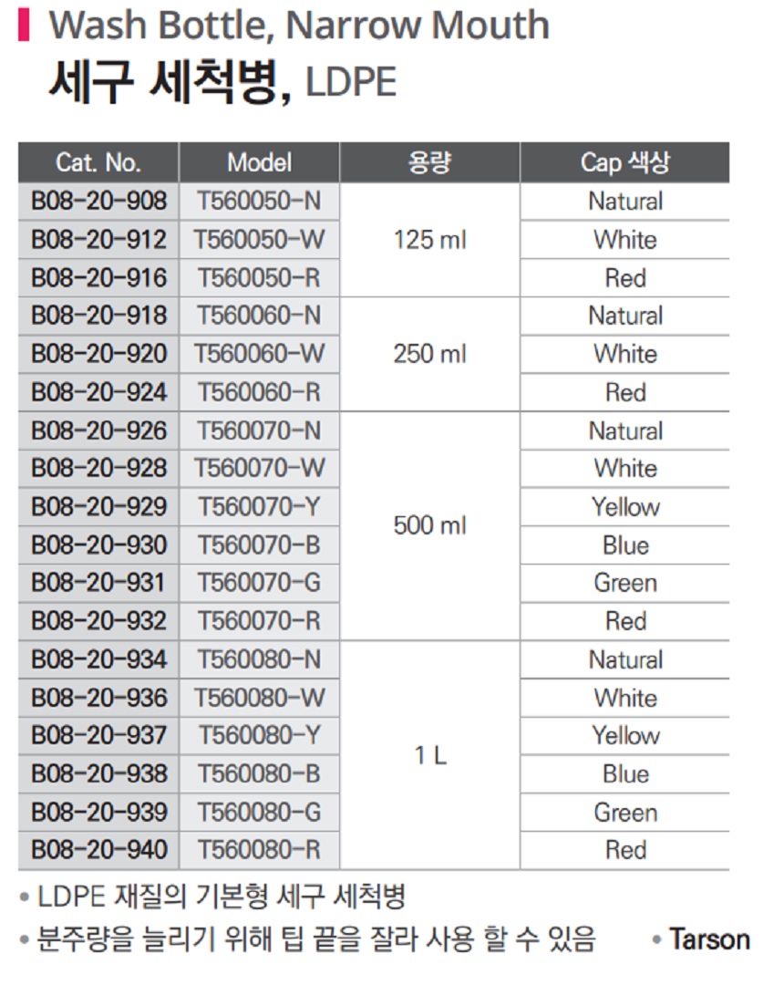 품명 ■ LDPE 재질의 기본형 세구 세척병 ■ 분주량을 늘리기 위해 팁 끝을 잘라 사용 할 수 있음 ■ Tarsons