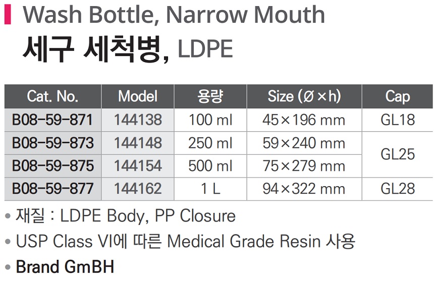품명 ■ 재질 : LDPE Body, PP Closure ■ USP Class VI에 따른 Medical Grade Resin 사용 ■ Brand GmBH