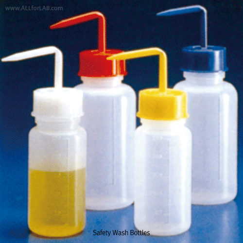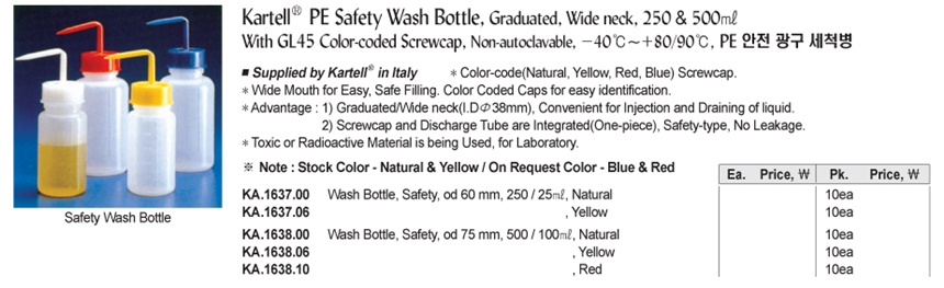 Kartell® PE Safety Wash Bottle, Graduated, Wide neck, 250 & 500㎖With GL45 Color-coded Screwcap, Non-autoclavable, -40℃~+80/90℃, PE 안전 광구 세척병