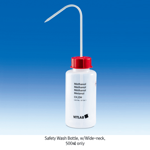 VITLAB® PE & PP Safety Imprinted/Wide-neck Wash Bottles, with VENT-CAP, GL45, 500㎖ Ideal for Chemical Substances, Hazard Symbol, PE & PP 안전세척병, 내압 방지 안전 벤트캡 구조