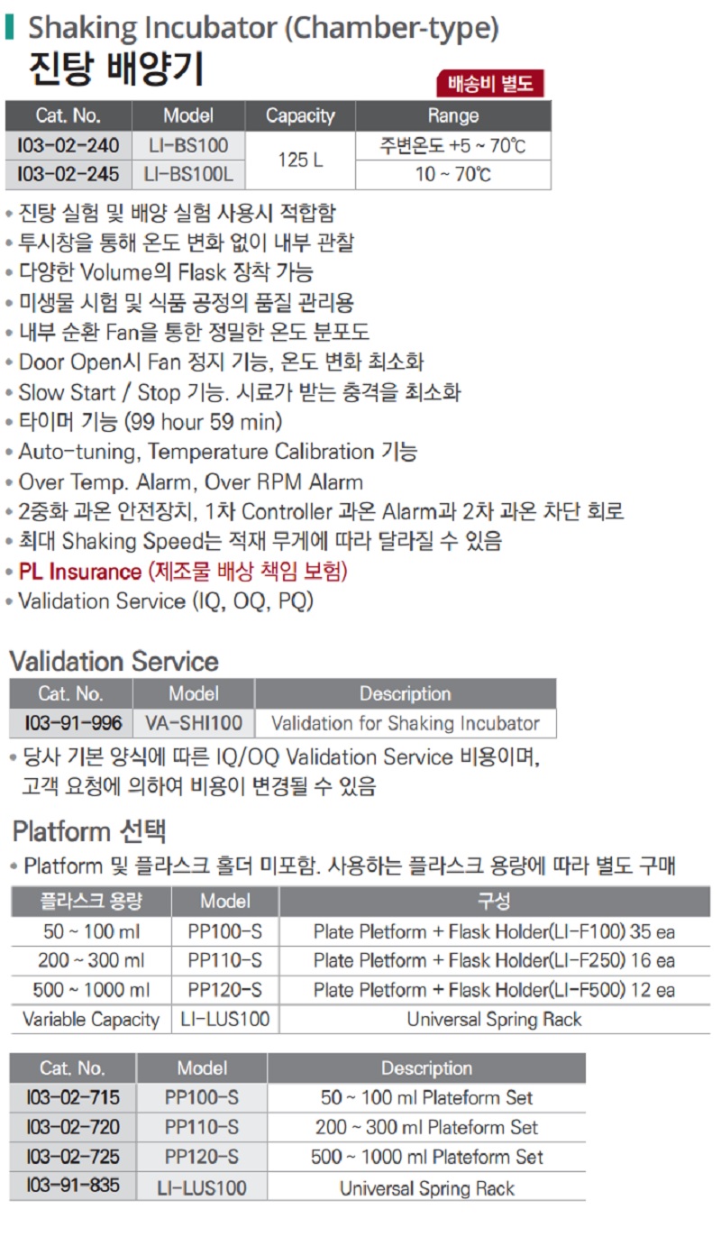 | 50 ~ 100 ml | PP100-S | Plate Pletform + Flask Holder(LI-F100) 35 ea |