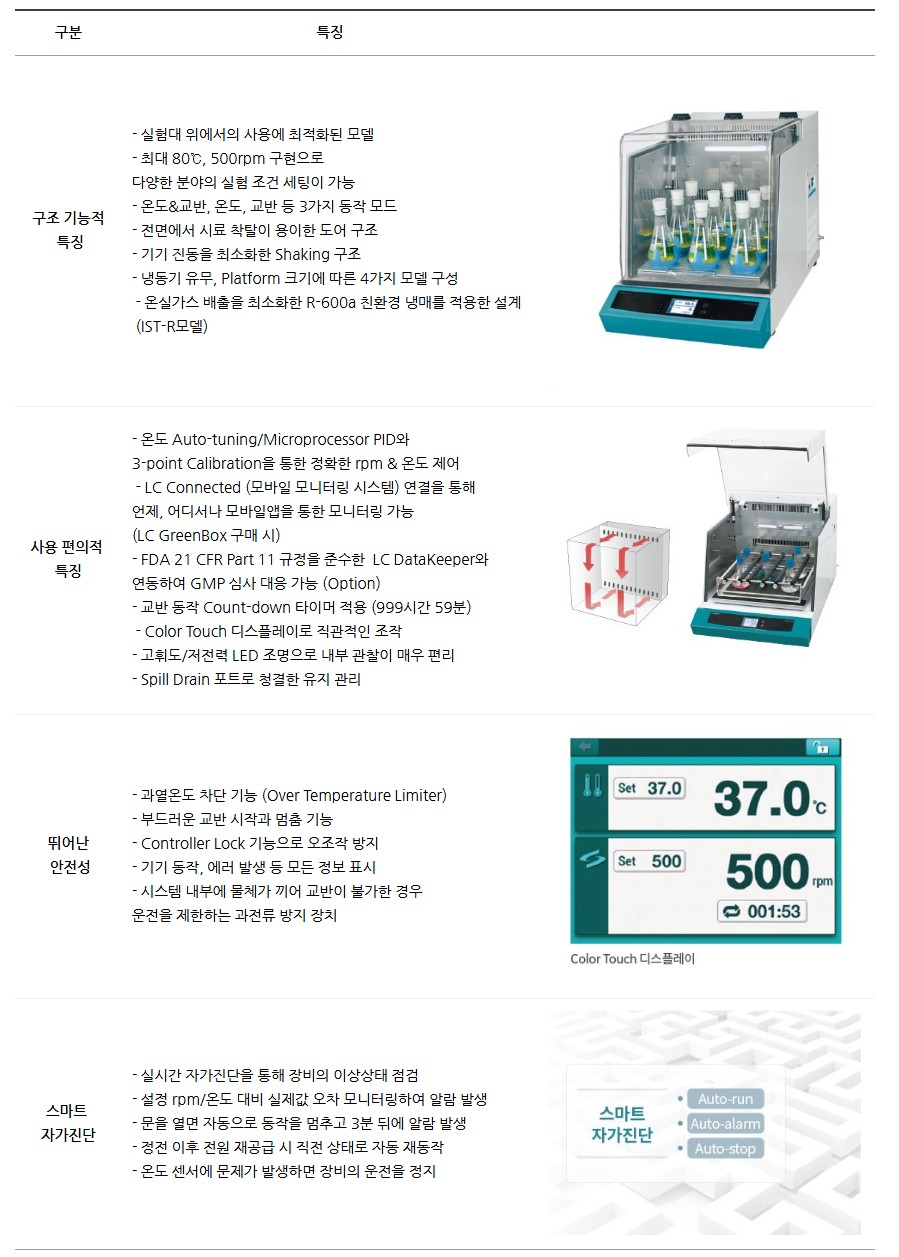 품명 실험실용 진탕 배양기 IST 시리즈, 최대 500rpm 고속 진탕 및 정밀 온도 제어, 스마트 자가진단 기능 탑재.