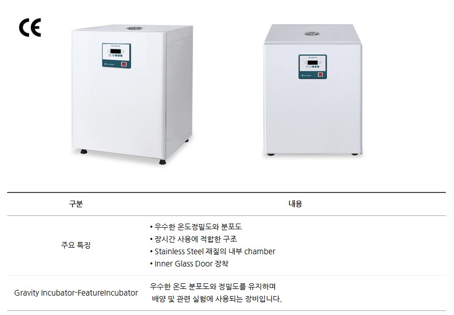 일반형 배양기 Gravity Incubator는 우수한 온도 정밀도와 분포도를 자랑하며, 장시간 사용에도 안정적인 구조로 설계되었습니다.