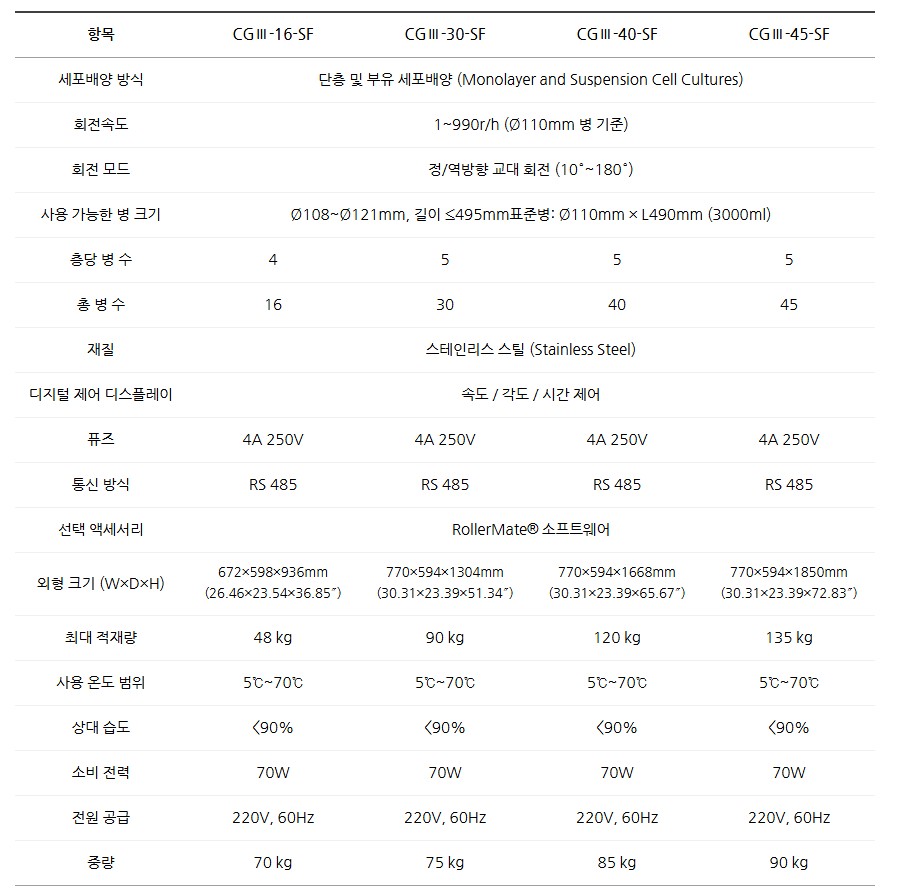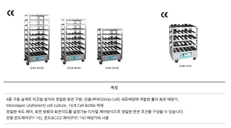 품명 롤러 회전 세포 배양기 CGⅢ 시리즈. 단층·부착 세포배양용, CE 인증, 정·역회전 제어, RS485 통신, Stainless Steel 구조의 정밀 디지털 세포배양 시스템.