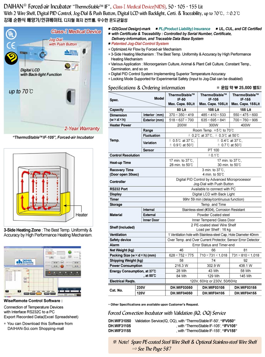 DAIHAN® Forced-air Incubator “ThermoStable TM IF” , Class- Ⅰ Medical Device(NIDS), 50·105·155 LitWith 2 Wire Shelf, Digital PID Control, Jog-Dial & Push Button, Digital LCD with Backlight, Certi. & Traceability , up to 70℃, ±0.2℃강제 순환식 배양기/인큐베이터, 디지털 퍼지 컨트롤, 우수한 온도균일성