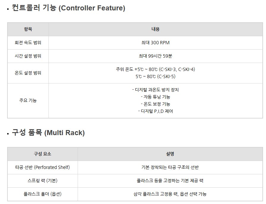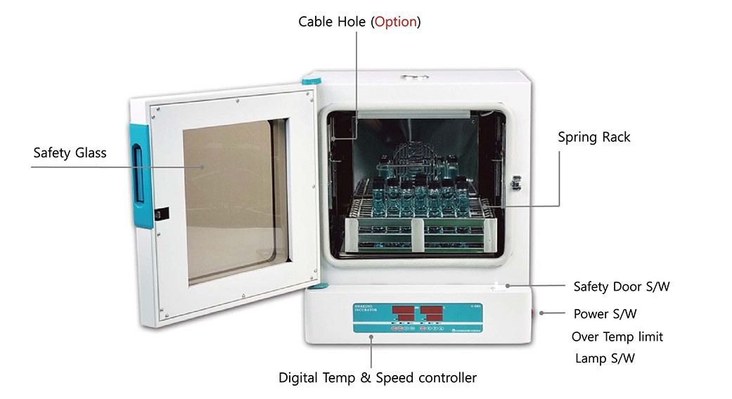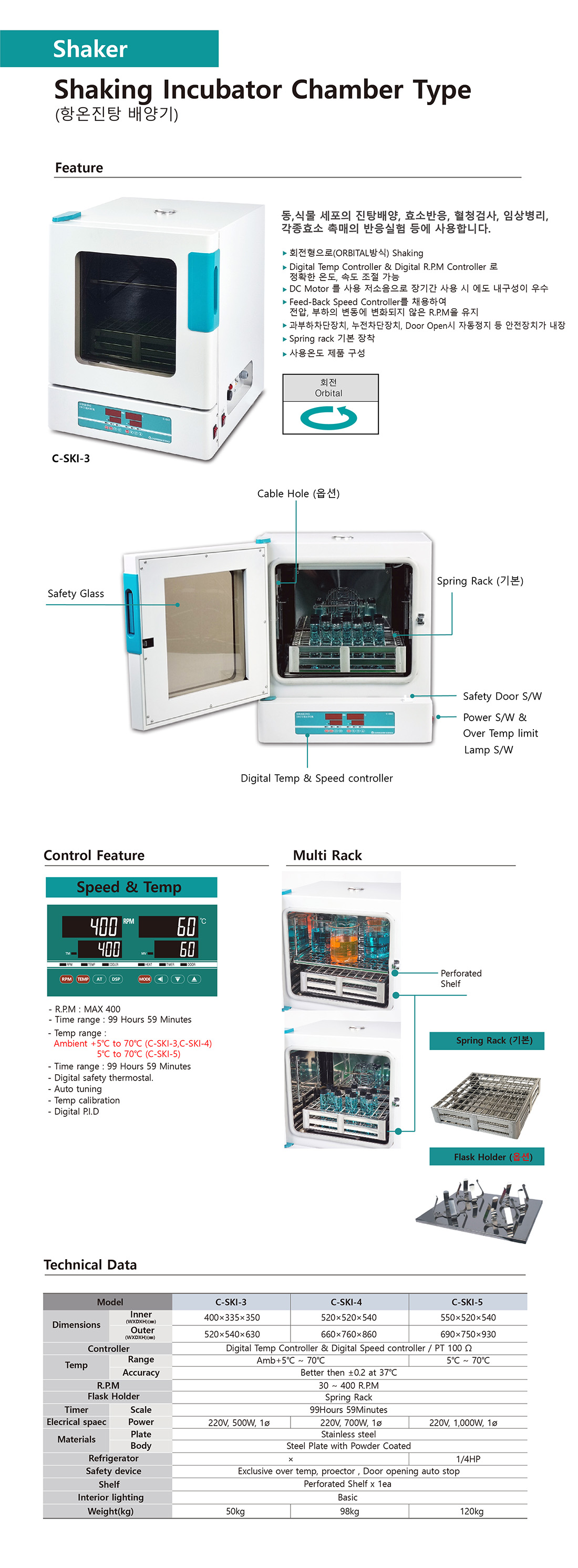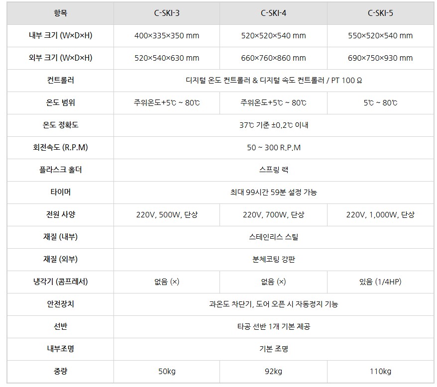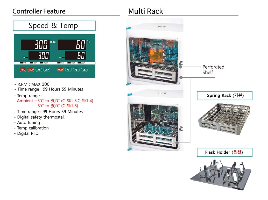 품명 디지털 진탕 + 항온기 일체형 인큐베이터! C-SKI 시리즈, RPM·온도 정밀 제어 및 스프링 랙 기본 장착.