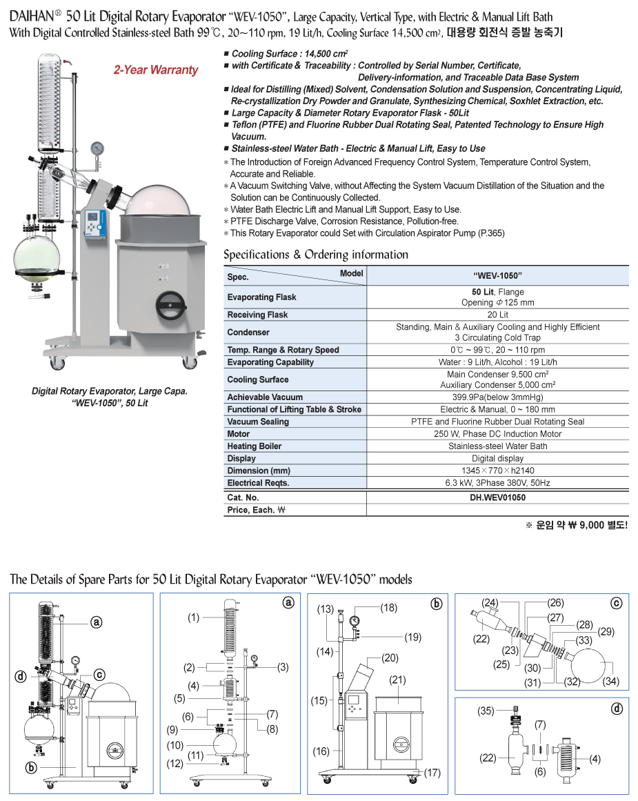 50 Lit Digital Rotary Evaporator “WEV-1050” , Large Capacity, Vertical Type, with Electric & Manual Lift BathWith Digital Controlled Stainless-steel Bath 99℃, 20~110 rpm, 19 Lit/h, Cooling Surface 14,500 cm 2