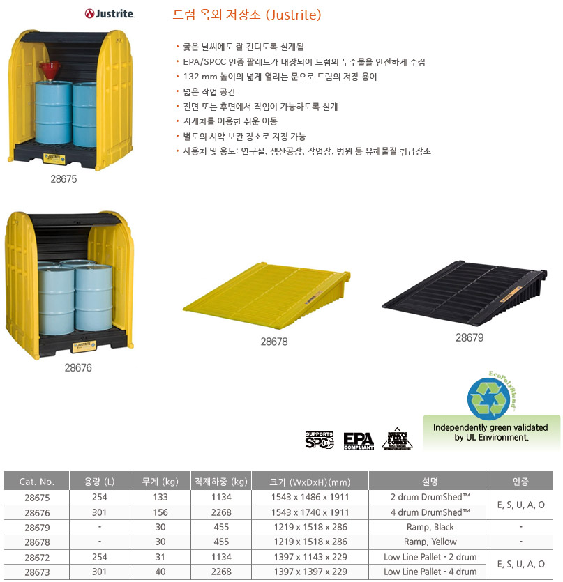 품명 드럼 옥외 저장소 (Justrite) ▶ 굳은 날씨에도 잘 견디도록 설계됨 ▶ EPA/SPCC 인증 팔레트가 내장되어 드럼의 누수물을 안전하게 수집 ▶ 132mm 높이의 넓게 열리는 문으로 드럼의 저장 용이 ▶ 넓은 작업 공간 ▶ 전면 또는 후면에서 작업이 가능하도록 설계 ▶ 지게차를 이용한 쉬운 이동 ▶ 별도의 시약 보관 장소로 지정 가능 ▶ 사용처 및 용도 : 연구실, 생산공장, 작업장, 병원 등 유해물질 취급장소