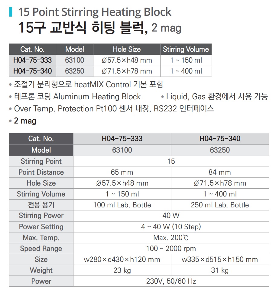 품명 ■ 조절기 분리형으로 heatMIX Control 기본포함 ■ 테프론 코팅 Aluminum Heating Block ■ Liquid, Gas 환경에서 사용가능 ■ Over Temp. Protection Pt100 센서 내장, RS232 인터페이스 ■ 2 mag