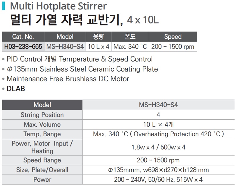 품명 ■ PID Control 개별 Temperature & Speed Control ■ Φ135mm Stainless Steel Ceramic Coating Plate ■ Maintenance Free Brushless DC Motor ■ DLAB