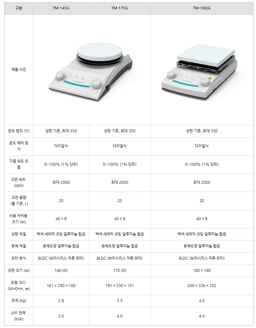 품명 350도 온도조절, 2000rpm 고속교반, BLDC 모터로 안전한 자석 교반기! 실험실 필수 장비, TM 시리즈