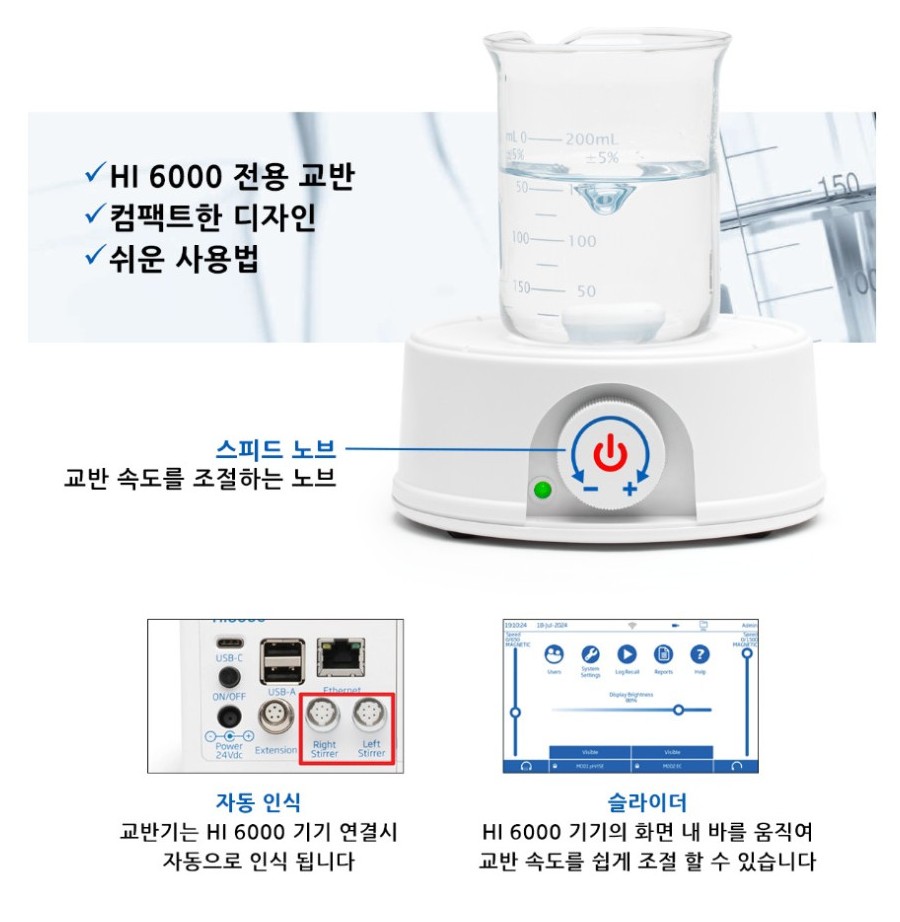 품명 HI6000180은 HI6000 전용 미니 마그네틱 교반기로, 자동 인식 기능과 간편한 속도 조절이 특징입니다. 소형·컴팩트한 실험용 스터러입니다.