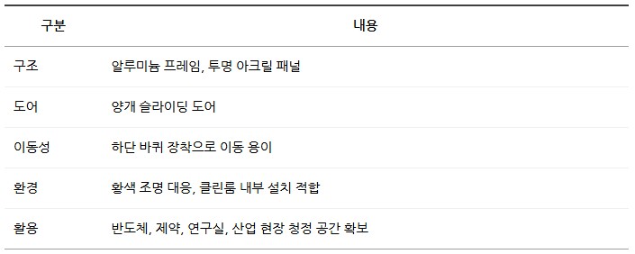 품명 알루미늄 프레임 크린부스, 양개 슬라이딩 도어와 이동형 구조. 반도체·제약·연구소 등 청정 환경 구축에 최적화된 장비.