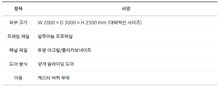 알루미늄 프레임과 투명 패널로 제작되며, 양개 슬라이딩 도어 구조와 이동형 바퀴를 적용하여 설치와 이동이 편리합니다.