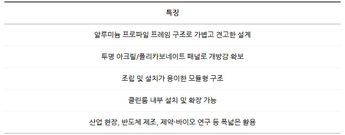 품명 알루미늄 프레임 크린부스, 반도체·제약·바이오 연구소 및 산업 현장 맞춤형 청정 작업 환경 구축. 모듈형 구조와 투명 패널로 설치 용이.