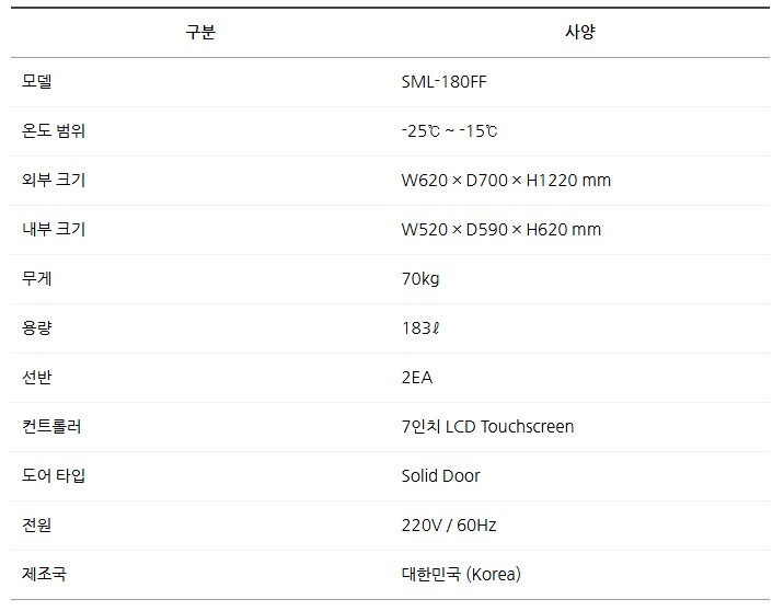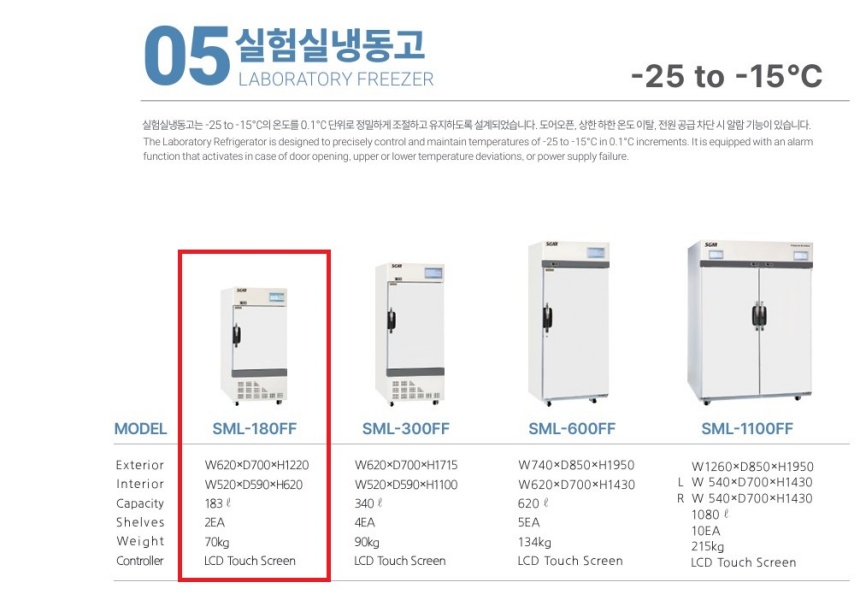 품명 SML-180FF 실험실 냉동고, -25℃~-15℃ 제어, 183ℓ 소형 용량, 7인치 LCD 터치스크린과 알람 기능 탑재 연구용 냉동기