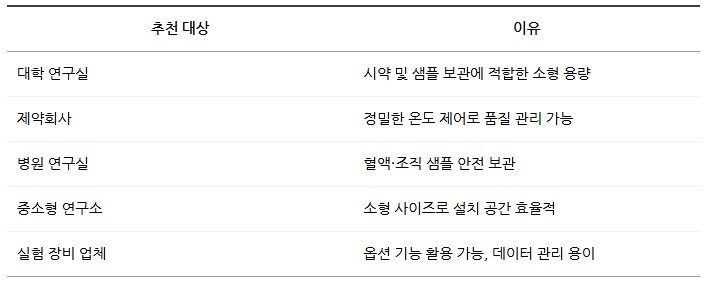 183ℓ 용량의 소형 모델로, 대학 연구실, 제약사, 병원 연구실 등에서 시약, 바이오 샘플, 실험 재료 보관에 적합합니다.