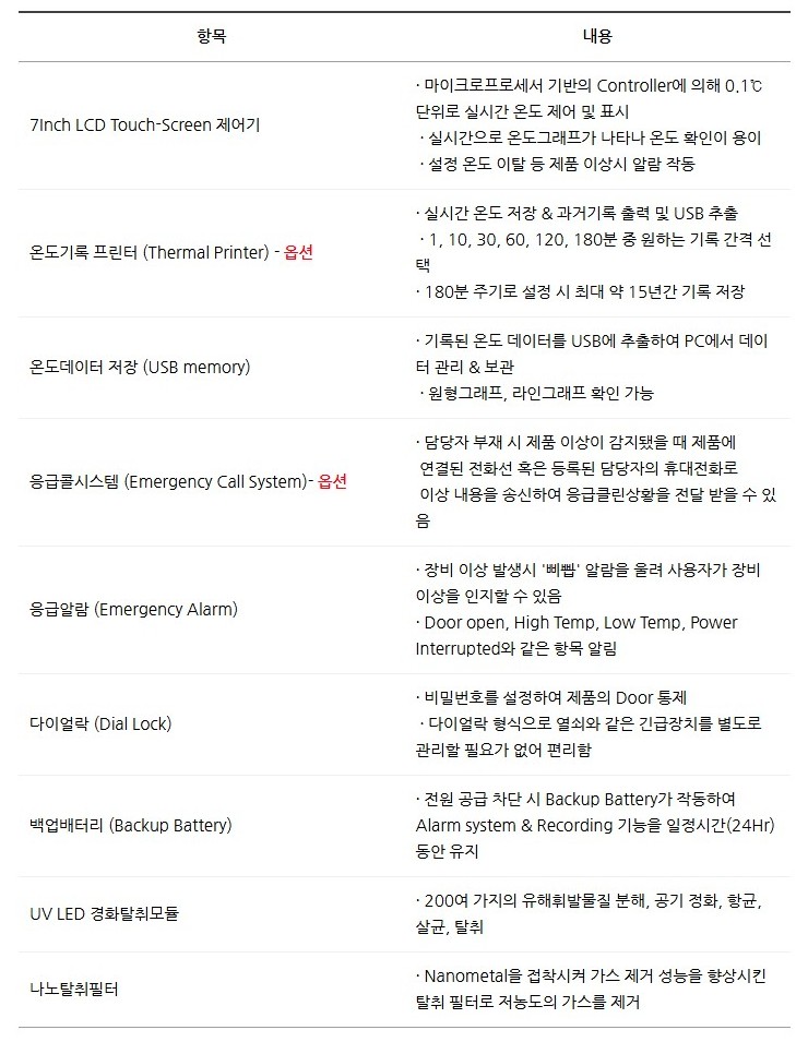 또한 다이얼락, 온도 기록 프린터, 비상 알림 시스템 등 다양한 옵션을 통해 보안성과 편의성이 강화된 제품입니다.