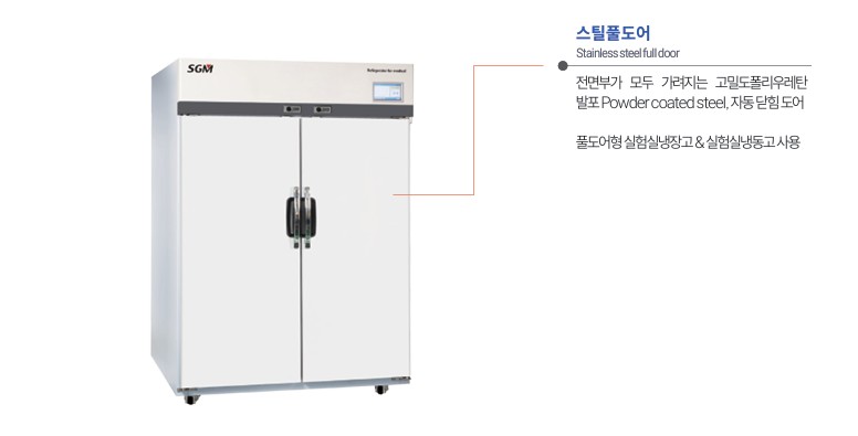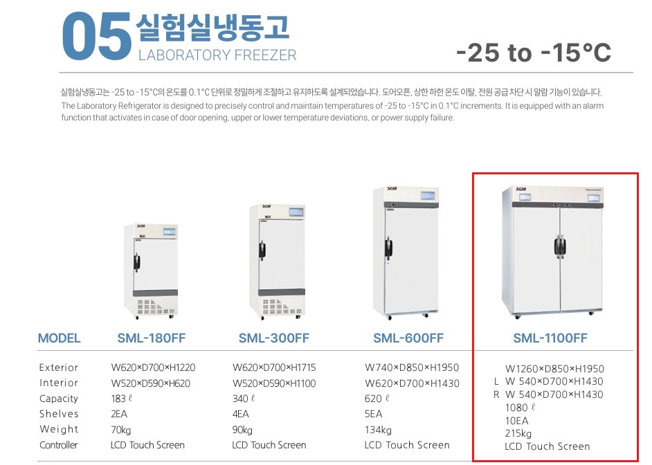 품명 SML-1100FF 실험실 냉동고, -25℃~-15℃ 온도 제어, 1080L 대용량, 7인치 LCD 제어기와 안전장치 탑재, 연구소·제약기업 필수 장비.