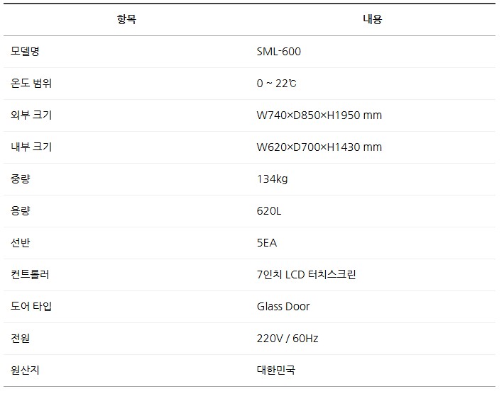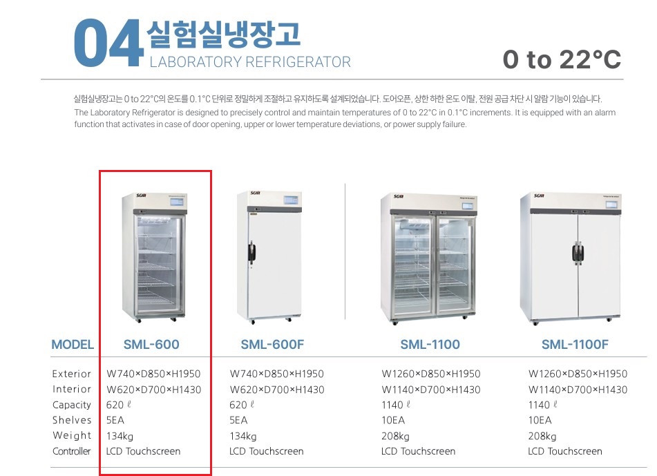품명 SML-600 실험실 냉장·냉동고. 620L 대용량, 0~22℃ 항온 제어, 7인치 LCD 터치스크린, 알람 및 백업 배터리 옵션 제공. 연구소, 제약사, 의료기관 최적화 장비.