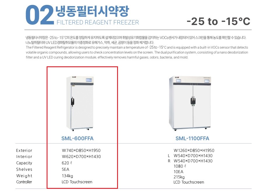 품명 SML-600FFA 냉동필터시약장, -25~-15℃ 정밀 제어, VOCs 센서·UV LED 탈취, 620L 대용량 실험실용 냉동고.