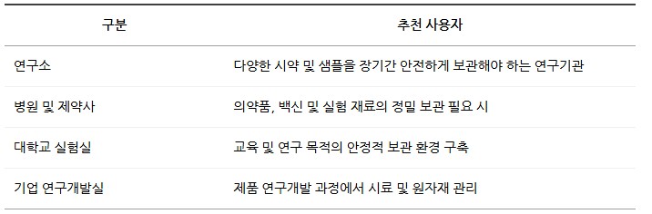 대형 연구소와 실험실에서 시약 및 샘플을 안전하게 보관할 수 있도록 설계되었습니다.