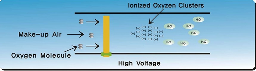 고전압 장치를 통해 공기 중 산소 분자를 이온화하고, 이를 통해