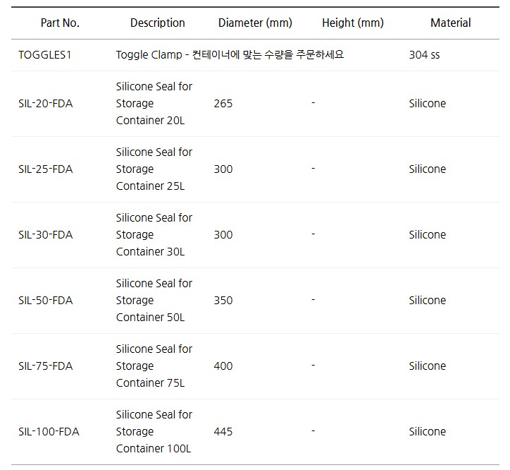 토글 클램프와 실리콘 씰(FDA 등급)은 선택사항으로 견고한 밀폐가 가능합니다.