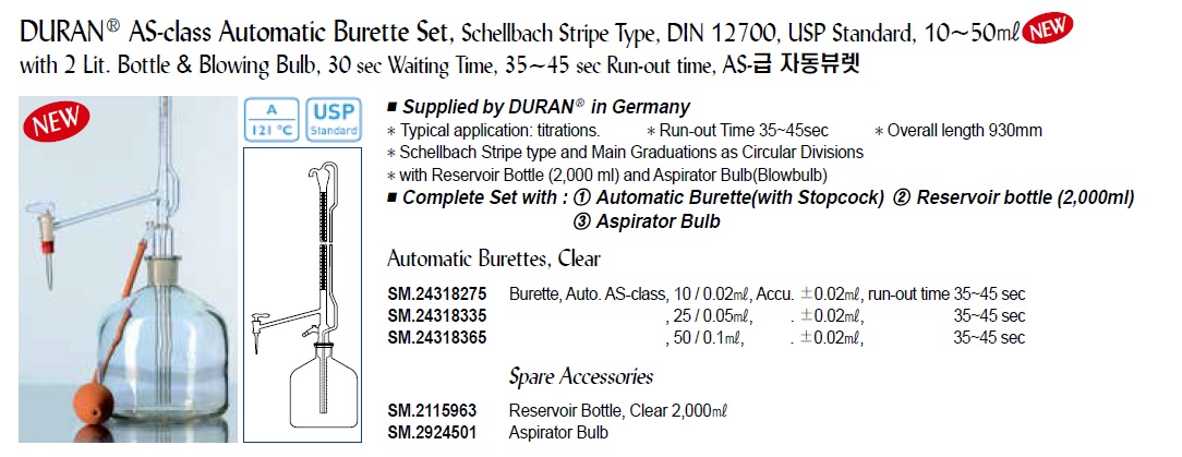 DURAN® AS-class Automatic Burette Set, Schellbach Stripe Type, DIN 12700, USP Standard, 10~50㎖ with 2 Lit. Bottle & Blowing Bulb, 30 sec Waiting Time, 35~45 sec Run-out time