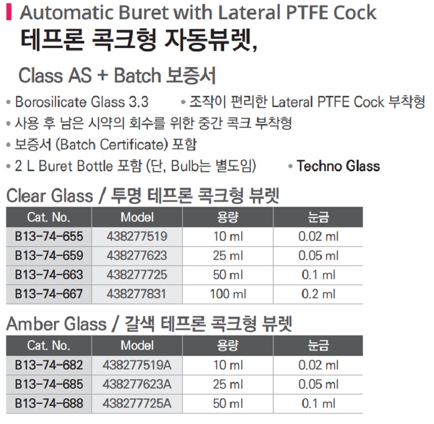 테프론 콕크형 자동뷰렛, Class AS, Automatic Buret with Lateral PTFE Cock B13-74-655