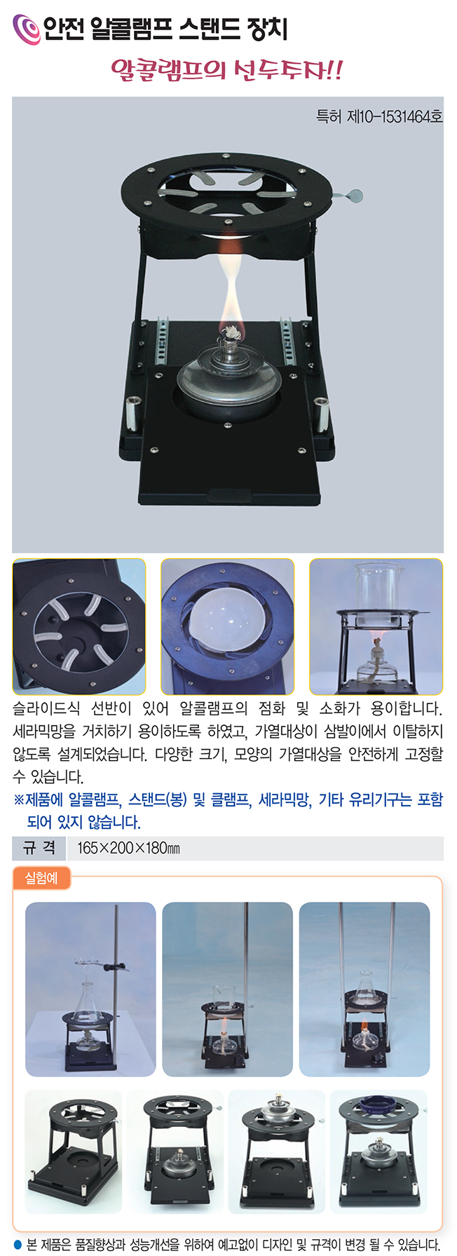 품명 알코올램프 사용 시 안전성을 높여주는 슬라이드식 스탠드 장치입니다. 세라믹망·유리기구를 안정적으로 지지하며 가열 대상이 움직이지 않도록 설계된 실험용 안전 가열 스탠드입니다.