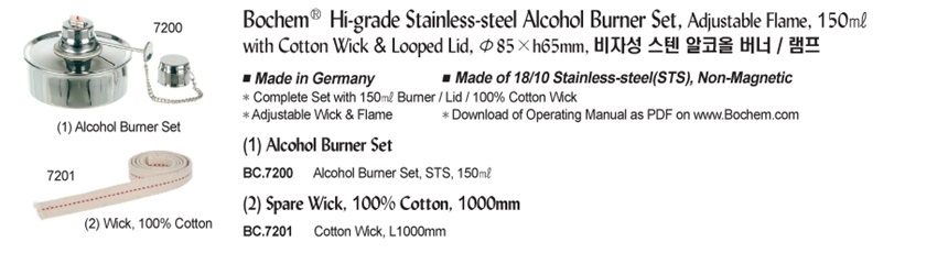 Bochem® Hi-grade Stainless-steel Alcohol Burner Set, Adjustable Flame, 150㎖ with Cotton Wick & Looped Lid, Φ85×h65mm, 비자성 스텐 알코올 버너 / 램프