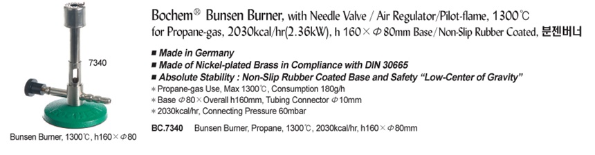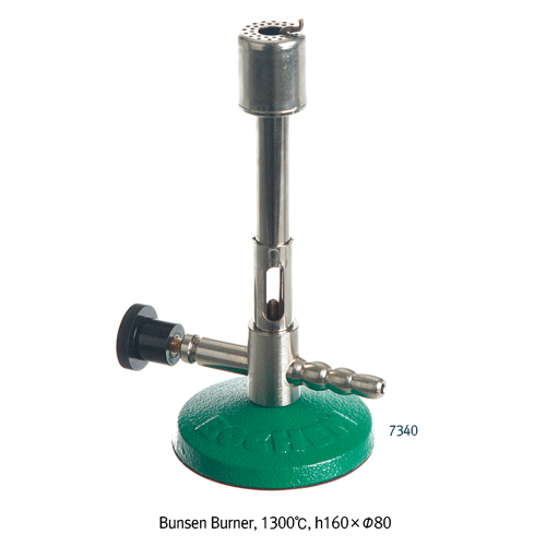 Bochem® Bunsen Burner, with Needle Valve / Air Regulator/Pilot-flame, 1300℃ for Propane-gas, 2030kcal/hr(2.36kW), h 160×Φ80mm Base/Non-Slip Rubber Coated, 분젠버너