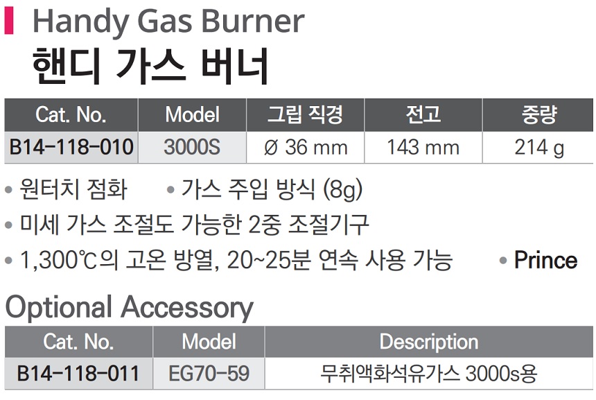 품명 ■ 원터치 점화 ■ 가스 주입 방식 (8g) ■ 미세 가스 조절도 가능한 2중 조절기구 ■ 1,300℃의 고온 방열, 20~25분 연속 사용 가능 ■ Prince
