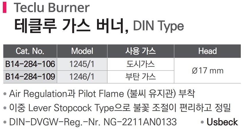 품명 ■ Air Regulation과 Pilot Flame (불씨 유지관) 부착 ■ 이중 Lever Stopcock Type으로 불꽃 조절이 편리하고 정밀 ■ DIN-DVGW-Reg.-Nr. NG-2211AN0133 ■ Usbeck