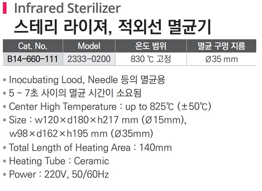 품명 ■ Inocubating Lood, Needle 등의 멸균용 ■ 5 ~ 7초 사이의 멸균 시간이 소요됨 ■ Center High Temperature : up to 825℃ (±50℃) ■ Size : w120×d180×h217 mm (Ø15mm), w98×d162×h195 mm (Ø35mm) ■ Total Length of Heating Area : 140mm ■ Heating Tube : Ceramic ■ Power : 220V, 50/60Hz