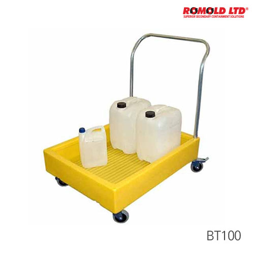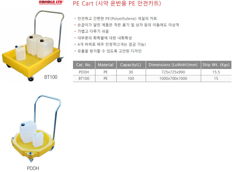 품명 PE Cart (시약 운반용 PE 안전카트) ▶ 안전하고 간편한 PE(Polyethylene) 재질의 카트 ▶ 손잡이가 달린 제품은 작은 용기 및 상자 등의 이동에도 이상적 ▶ 가볍고 다루기 쉬움 ▶ 대부분의 화학물에 대한 내화학성 ▶ 4개의 바퀴로 매우 안정적(2개는 잠금 가능) ▶ 유출을 방지할 수 있도록 고안된 디자인