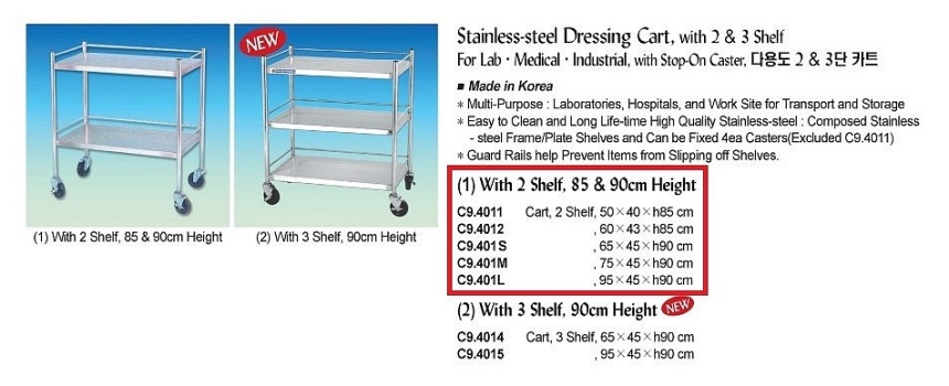 품명 청결하고 오염이 없으며, 긴 수명의 All Stainless Steel 제품 스템 프레임, 스텐 Plate Shelves 및 위치 고정 가능한 4개의 바퀴로 구성