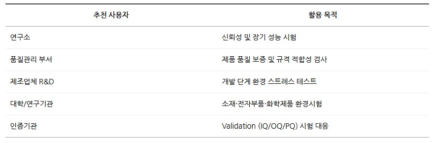 ±0.3℃, ±2.5%RH의 정밀도를 보장하며, 연구개발, 품질검사, 신뢰성 평가 등 다양한 분야에서 사용됩니다.