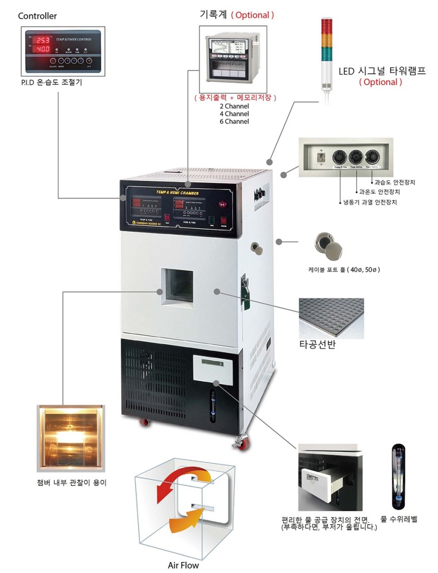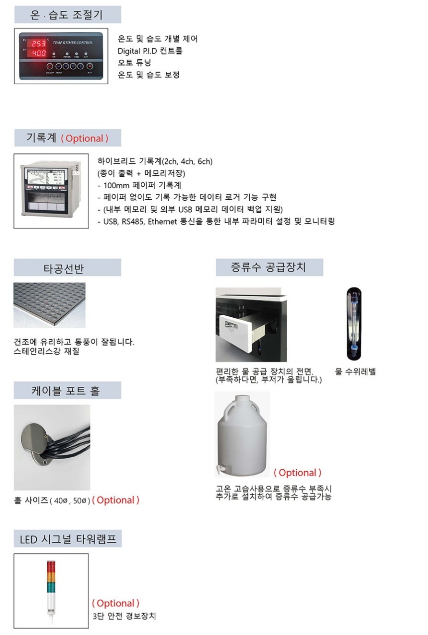 옵션으로 기록계, 타공선반, LED 신호등, 증류수 공급장치를 선택 구성할 수 있습니다.