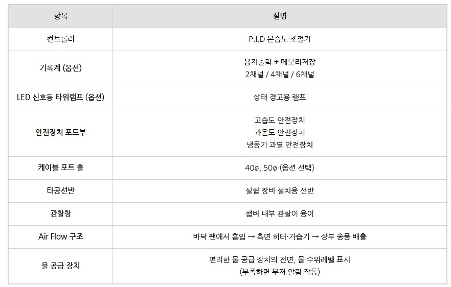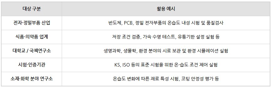 각종 실험, 품질검사, 내환경 시험 등 정밀한 온·습도 유지가 필요한 환경에서 사용되며,