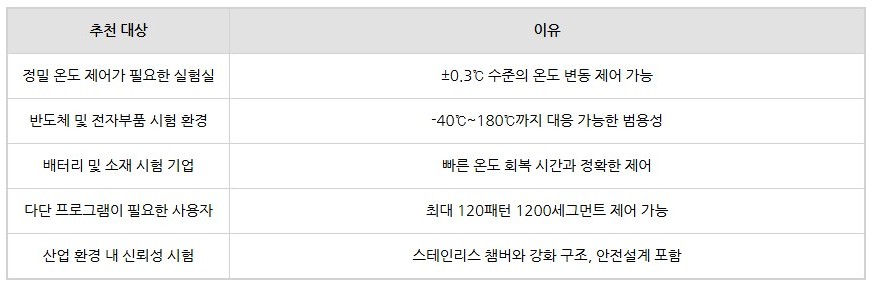 반도체, 배터리, 소재, 기구물 테스트 등 다양한 산업 분야에서 사용할 수 있는 고신뢰성 온도 챔버입니다.