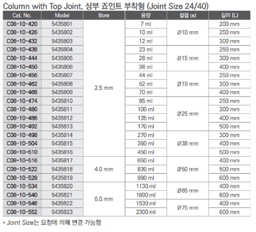 Column with Joint, 죠인트 부착형 (Joint Size 24/40)| Cat. No | Model | Bore | 용량 | 컬럼 O.D. | Length |