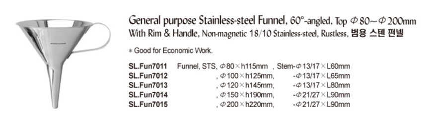 General purpose Stainless-steel Funnel, 60°-angled, Top Φ80~Φ200mmWith Rim & Handle, Non-magnetic 18/10 Stainless-steel, Rustless, 범용 스텐 펀넬