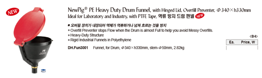 NewPig® PE Heavy Duty Drum Funnel, with Hinged Lid, Overfill Preventer, Φ340×h330mm Ideal for Laboratory and Industry, with PTFE Tape, 역류 방지 드럼 펀넬