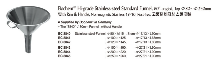 Bochem® Hi-grade Stainless-steel Standard Funnel, 60°-angled, Top Φ80~Φ250mmWith Rim & Handle, Non-magnetic Stainless-18/10, Rust-free, 고품질 비자성 스텐 펀넬