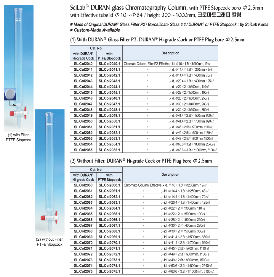 시랩 듀란 유리 크로마토그래피 칼럼, PTFE 스톱콕 보어 2.5mm
