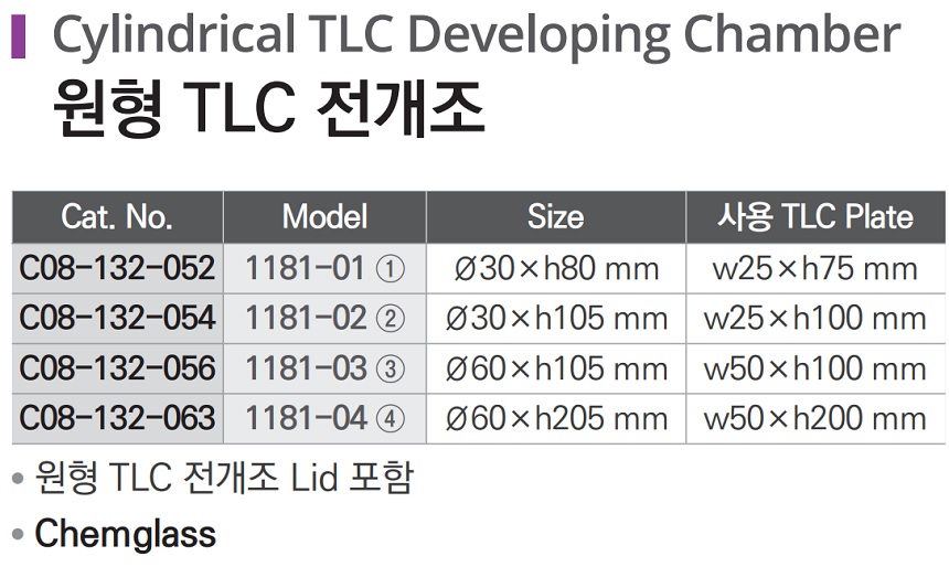 품명 ■ 원형 TLC 전개조 Lid 포함 ■ Chemglass