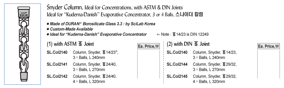 Snyder Column, Ideal for Concentrations, with ASTM & DIN JointsIdeal for “Kuderna-Danish” Evaporative Concentrator, 3 or 4 Balls